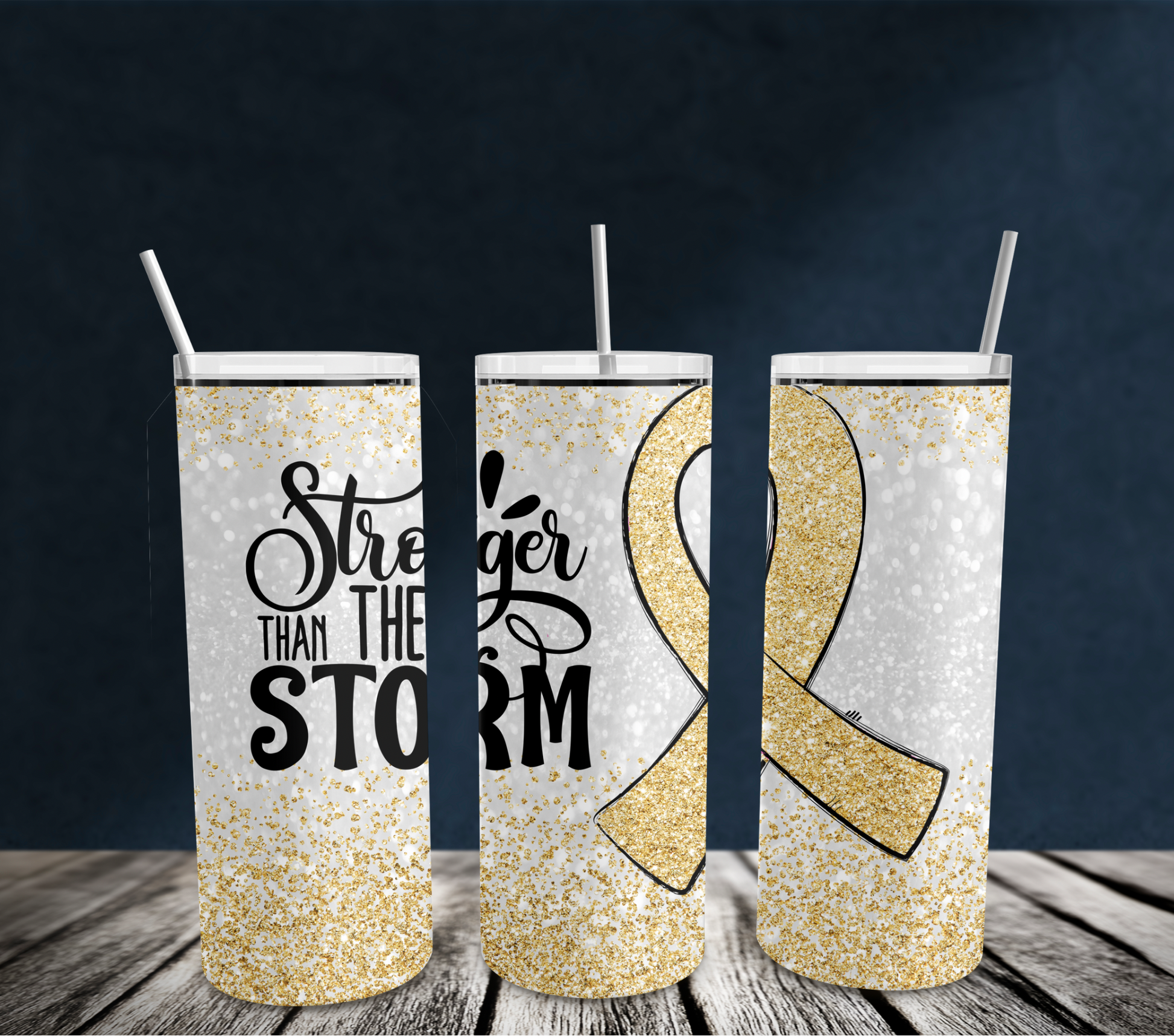 This 20oz tumbler is perfect for your on-the-go lifestyle. With the inspiring message "Stronger than the storm" and a gold ribbon design, it is not only stylish but also durable and functional. Keep your drinks at the perfect temperature and show your support for those fighting against the storm.