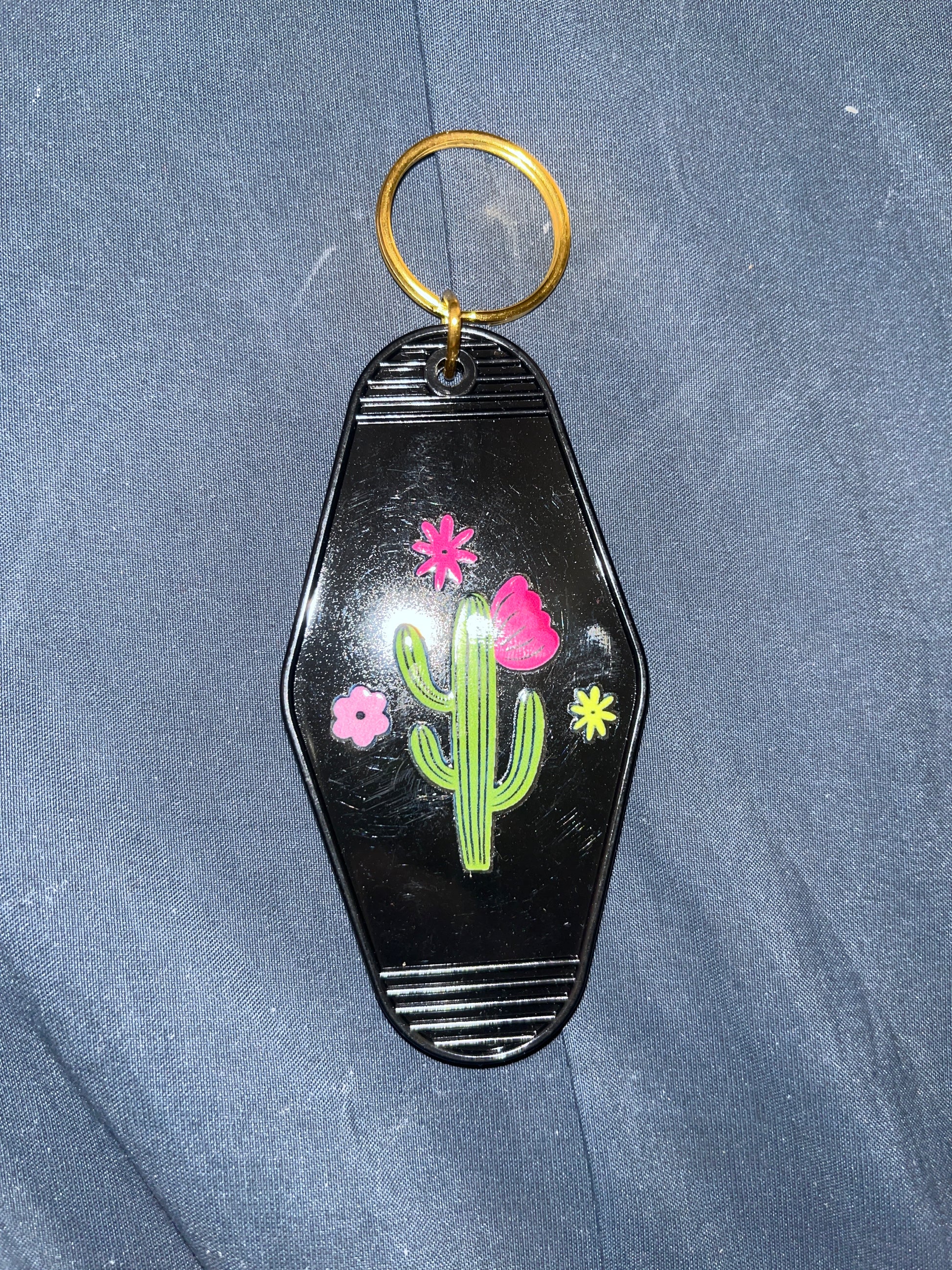 This sturdy and stylish MOTEL KEYCHAIN features a charming cactus design on a sleek black background. Made for durability and convenience, this keychain is perfect for on-the-go trips. Keep your keys organized and add a touch of personality to your everyday items while supporting a sustainable fashion choice.