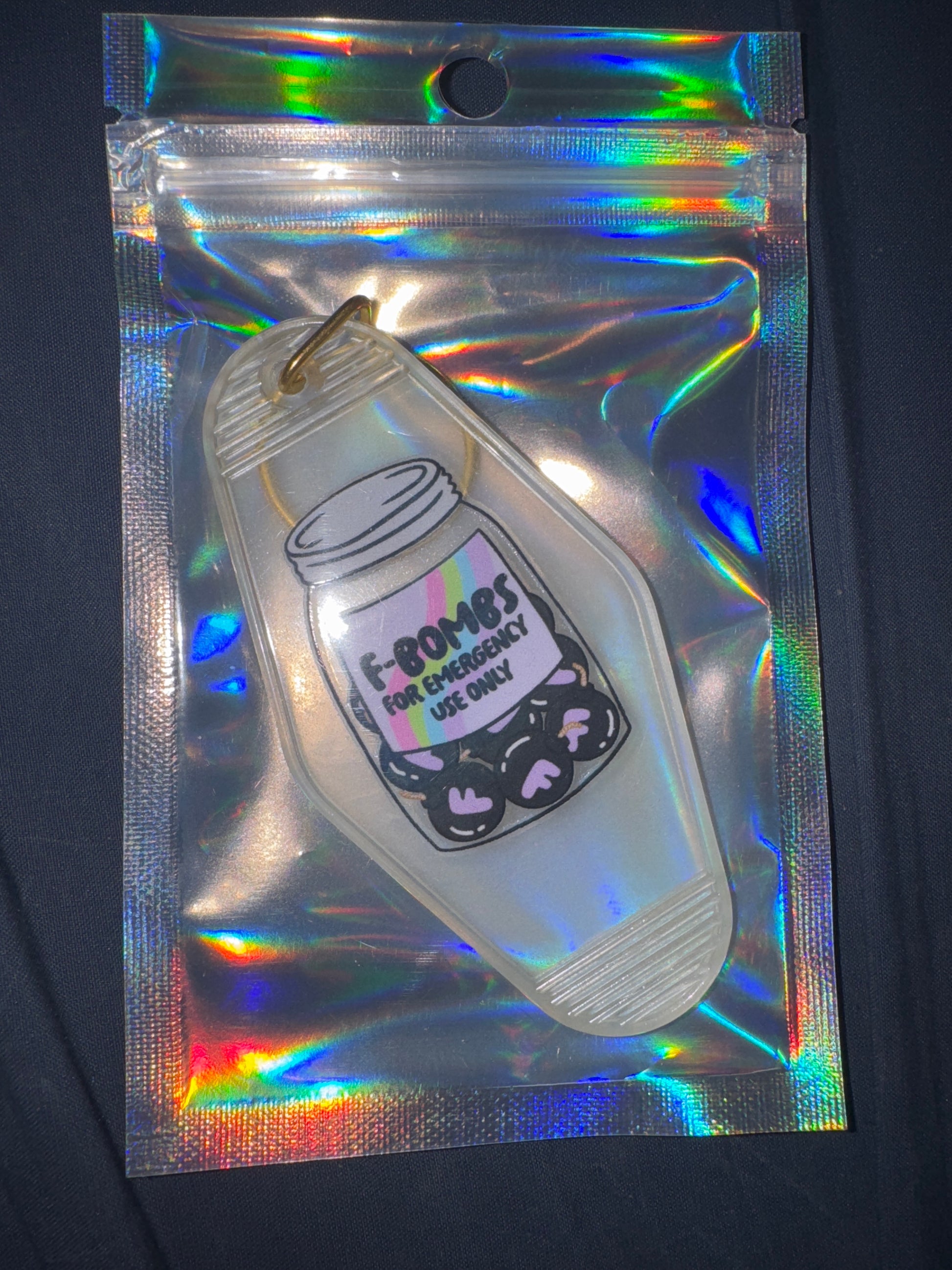 This MOTEL KEYCHAIN features bold "F Bombs" on a glow-in-the-dark background. Perfect for adding a touch of attitude to your keychain collection.